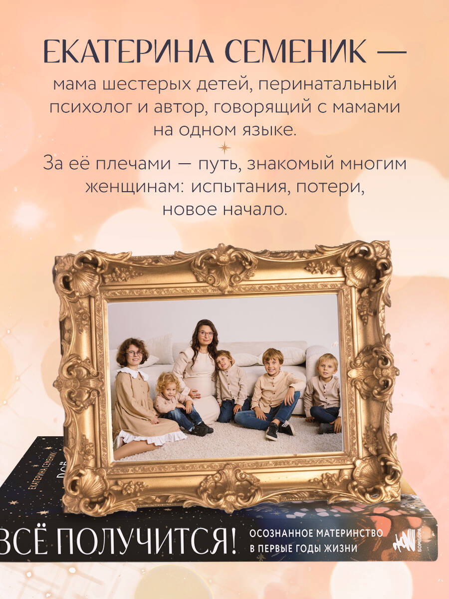 «Все получится! Осознанное материнство» — книга-поддержка для каждой мамы. Екатерина Семеник, многодетная мама и психолог, говорит с читательницей искренне и по-женски тепло. Без давления, без шаблонов и «правильных» сценариев. Только то, что работает — и проверено самой жизнью.