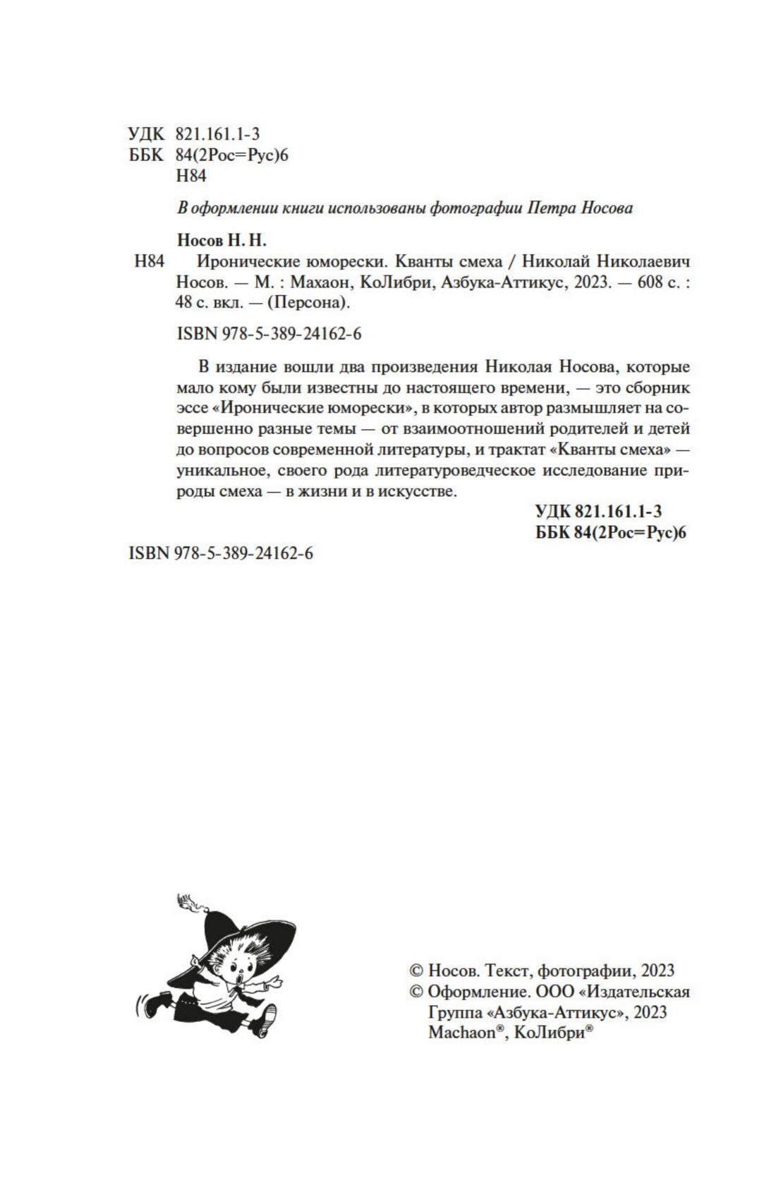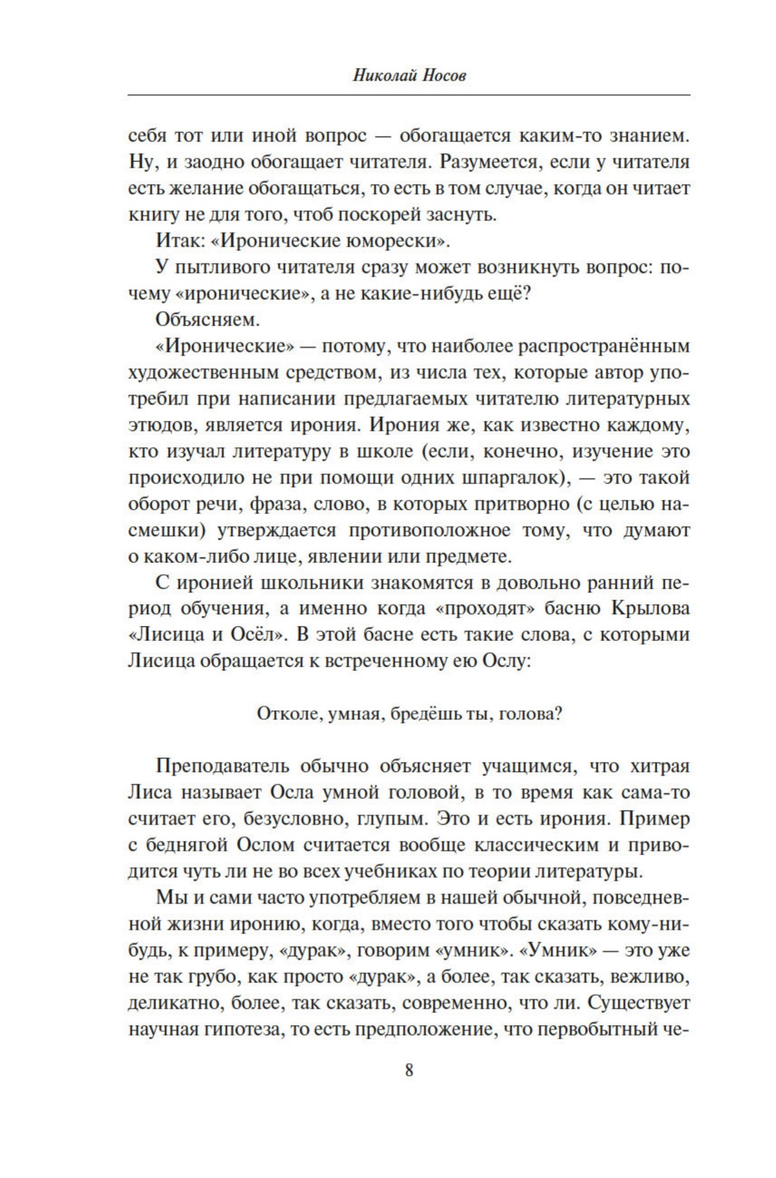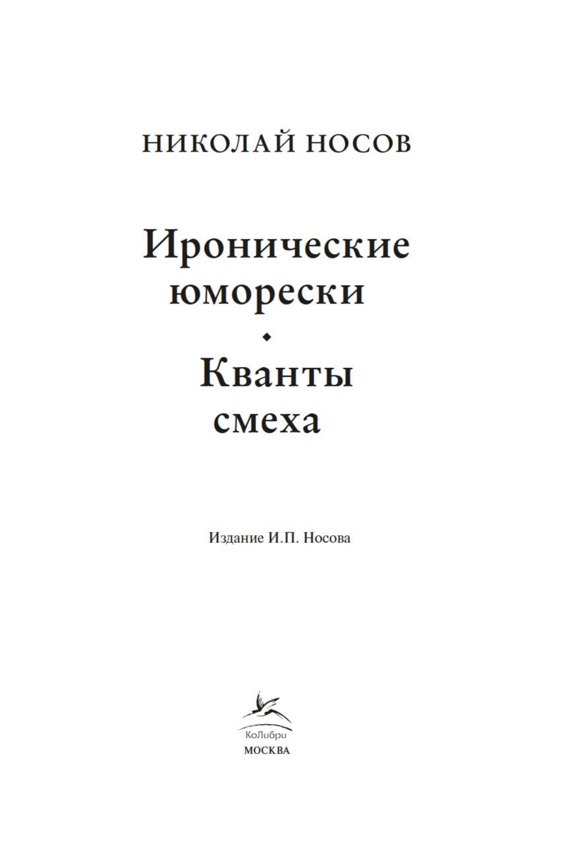 В издание вошли два произведения Николая Носова, которые мало кому были известны до настоящего времени, — это сборник эссе «Иронические юморески», в которых автор размышляет на со- вершенно разные темы — от взаимоотношений родителей и детей до вопросов современной литературы, и трактат «Кванты смеха» — уникальное, своего рода литературоведческое исследование при- роды смеха — в жизни и в искусстве.