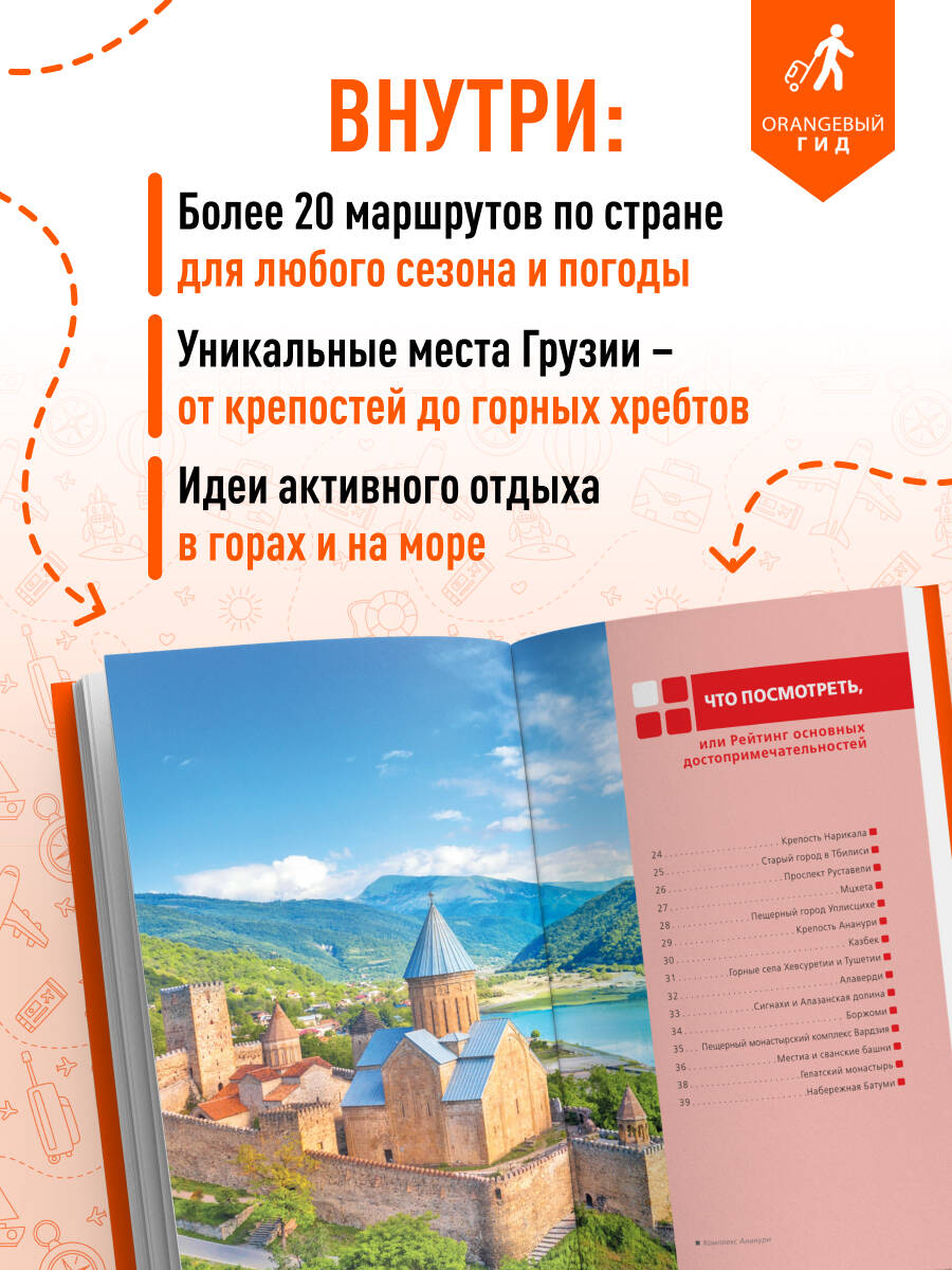 В нем содержится актуальная и полезная информация о главных городах страны, различные маршруты на любой вкус, подсказки, что делать, если идет дождь, или где искать лучшие смотровые площадки, а также множество полезных авторских советов. Посетите пещерный город Уплисцихе, песочные пляжи Батуми, город-курорт Боржоми, загадочные горные крепости — выбор только за вами!